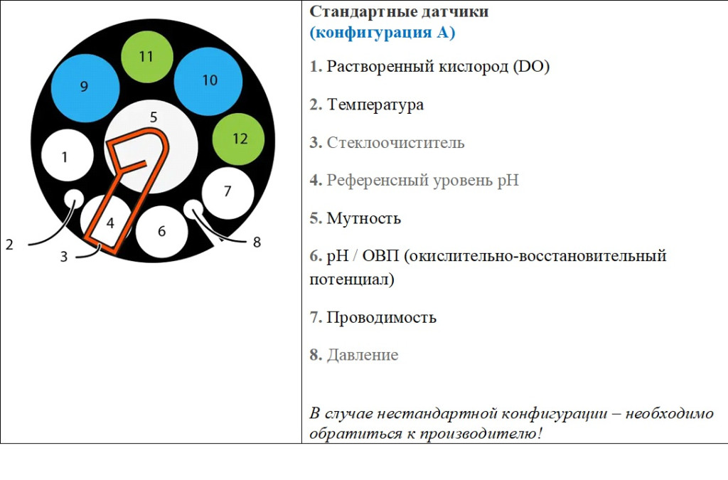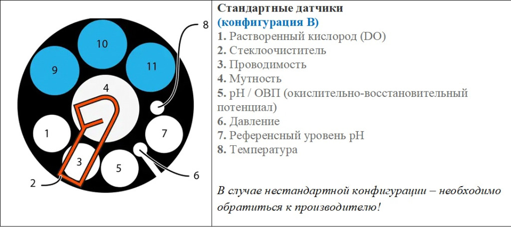 DO (оптика), температура, pH, электропроводность, мутность, референс pH, вайпер (стеклоочиститель)