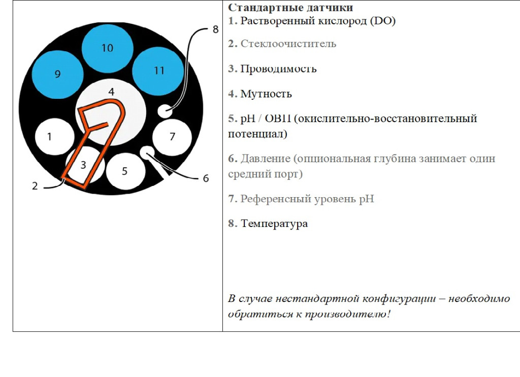 Температура, pH, электропроводность, DO (оптика), мутность, вайпер, антиобрастание (медный носовой обтекатель)